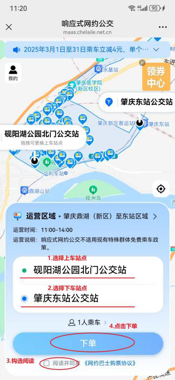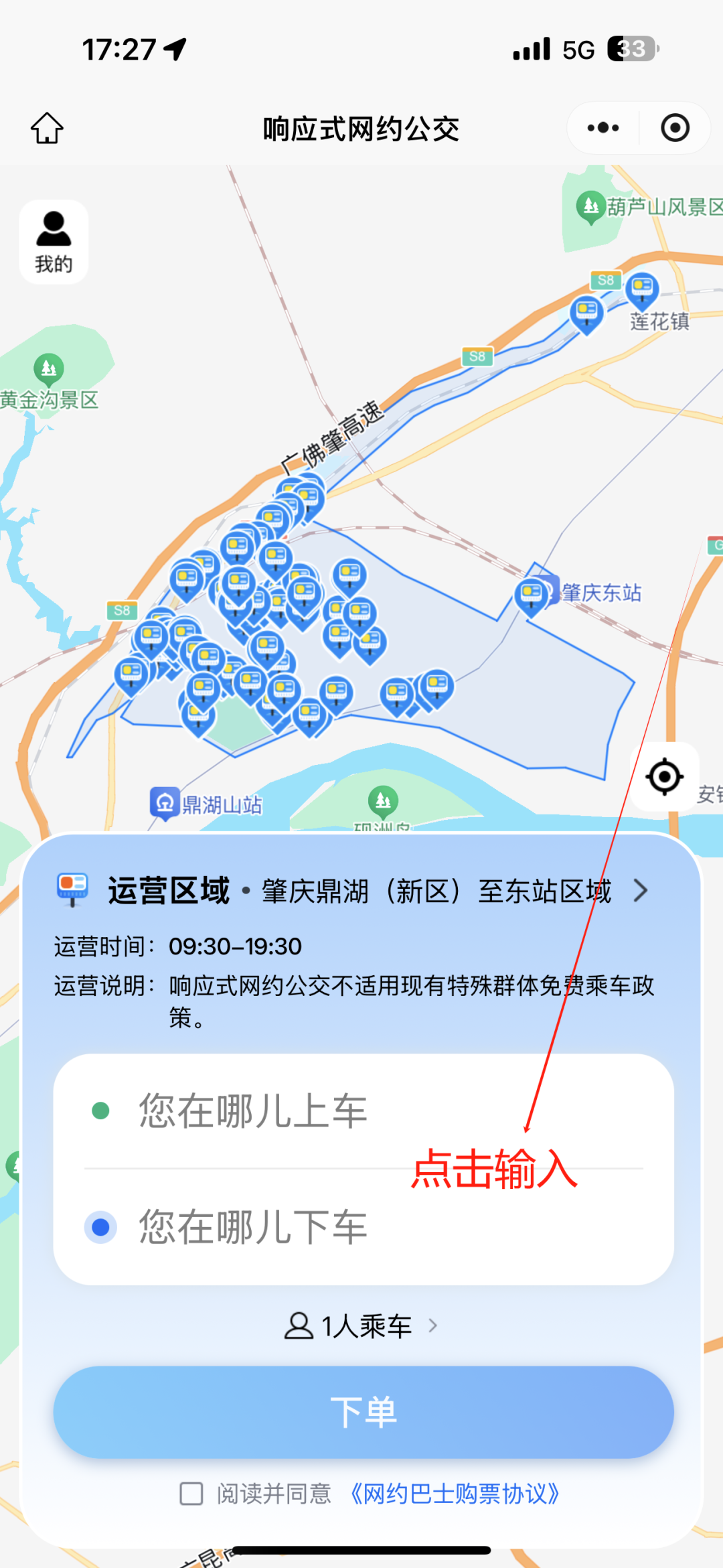 2.选择最近的乘车地点和目的站点,勾选“阅读并同意”《网约巴士购票协议》,就可点击下单。