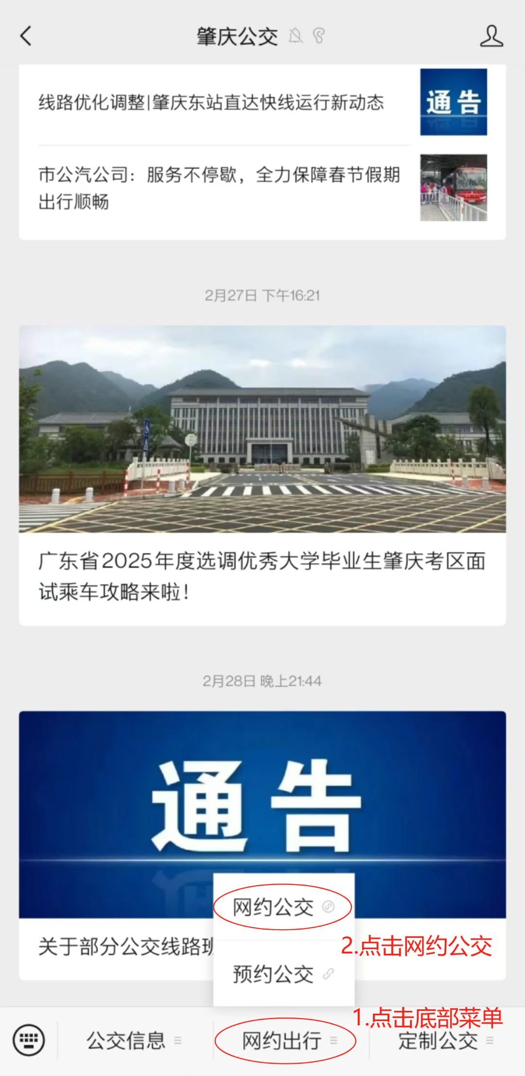 1.进入“肇庆公交”微信公众号,点击进入“网约出行”的“网约公交”菜单。